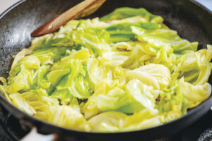 フライパンににんにく・赤唐辛子・オリーブオイルを熱し、香りが出てきたらキャベツを加えて、しんなりするまで炒める。